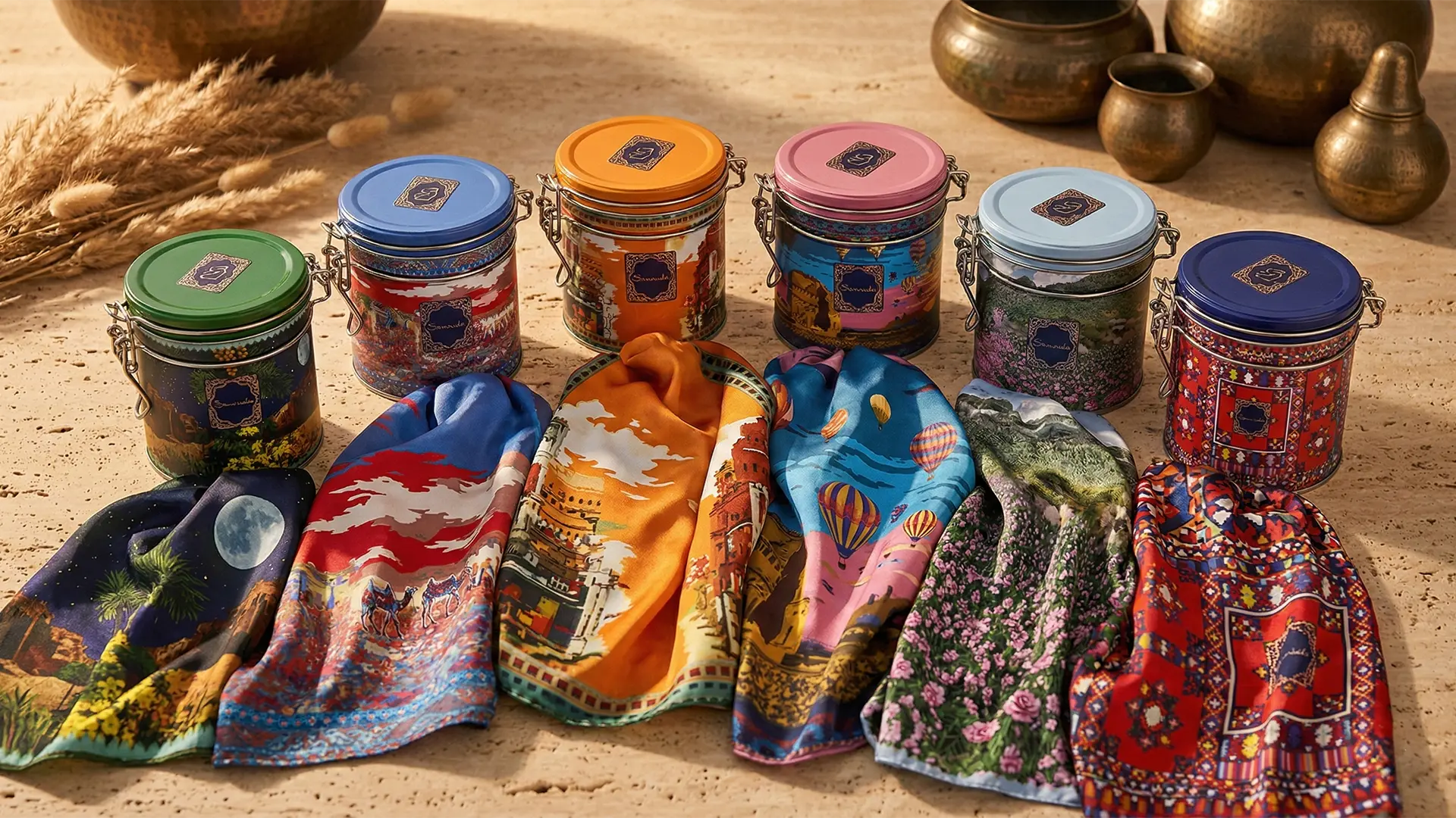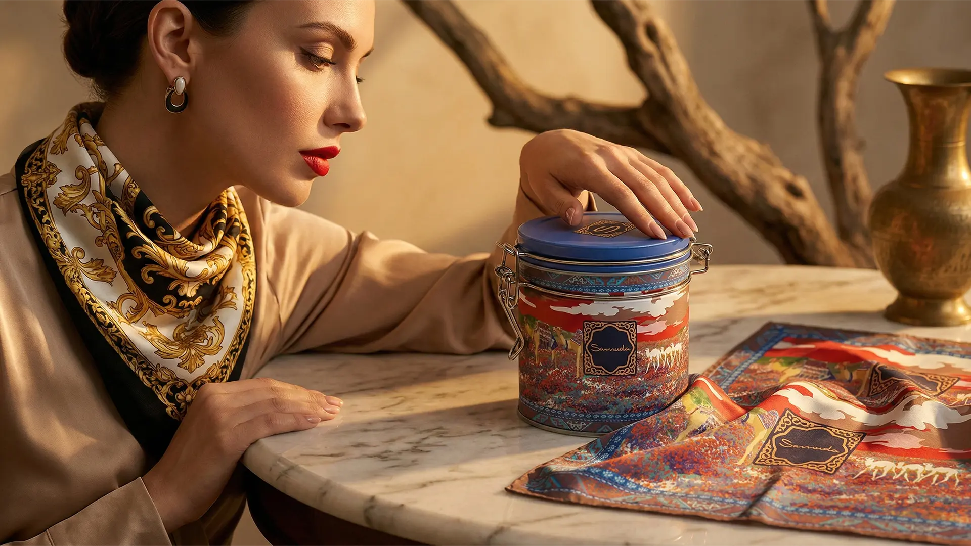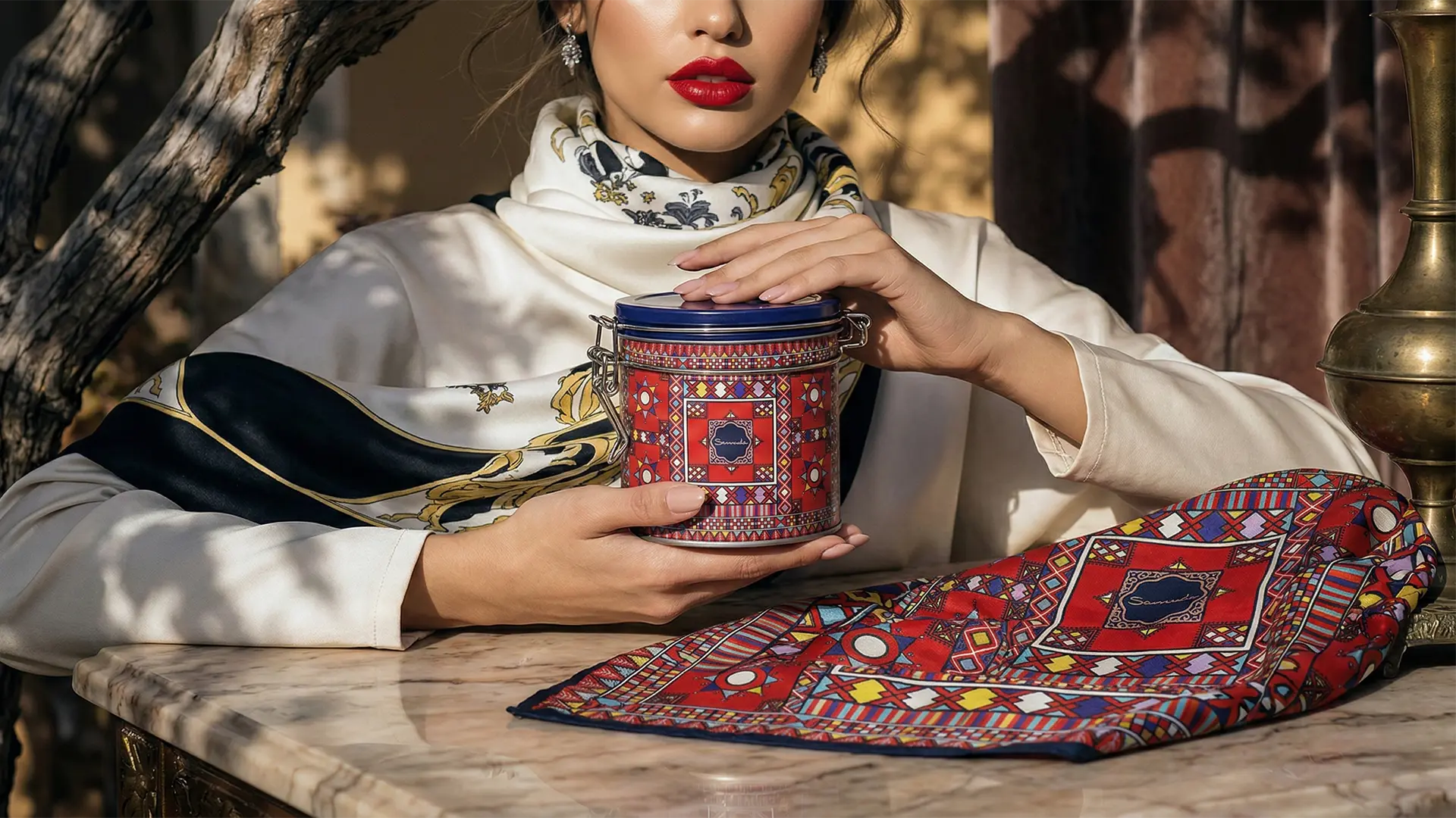 Collaborating with Samuda on their new line of silk scarves was a rewarding design journey. Tasked with crafting a truly immersive experience, we went beyond simple packaging. We designed both the unique metal clip-top canisters and the intricately detailed silk scarves themselves, ensuring a cohesive and sophisticated brand aesthetic. The primary inspiration behind the hermetic clip-lock closure was to allow a user’s favorite fragrance to linger and scent the silk, creating a truly personal and evocative connection. Every element, from the sophisticated Arabic-inspired patterns to the meticulous design of the containers, reflects Samuda’s dedication to quality and our studio’s multi-disciplinary design expertise, spanning both product packaging and textile print design.